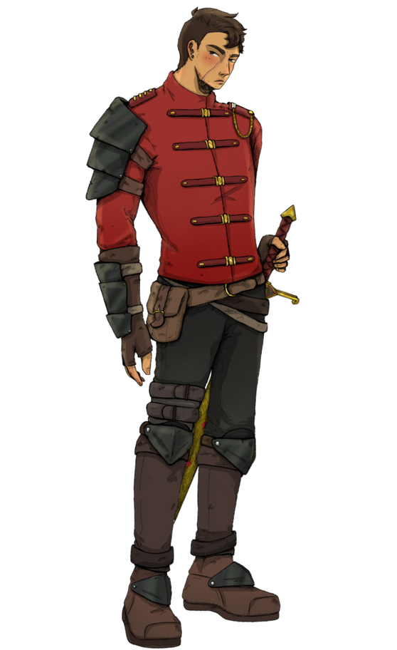 Dante Starr (he/him), a 28 year old trans gay man. A master swordsman, former guard for the royal family. Has trouble processing emotions.