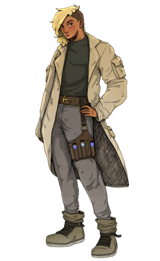 Cobalt Torres (he/them), a 25 year old nonbinary bisexual person. Both of his legs are prosthesis designed and built by Chantelle. He's very edgy.